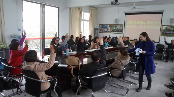 3月10日下午,新葡萄8883官网在学院会议室召开全体工会会员和教职工参加的第二届第五次代表大会,大会由彭杨主持。本次教代会主要有改选分工会主席和审议院聘系主任实施办法并推荐系主任岗位人选的两个议程。