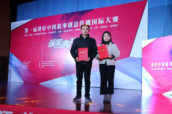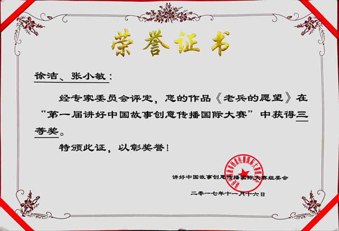 第一届“讲好中国故事”创意传播国际大赛颁奖典礼于11月16日下午在国家会议中心举行,公司新葡萄8883官网杨晓军老师指导,徐洁、张小敏同学创作的作品《老兵的愿望》荣获大赛三等奖。
