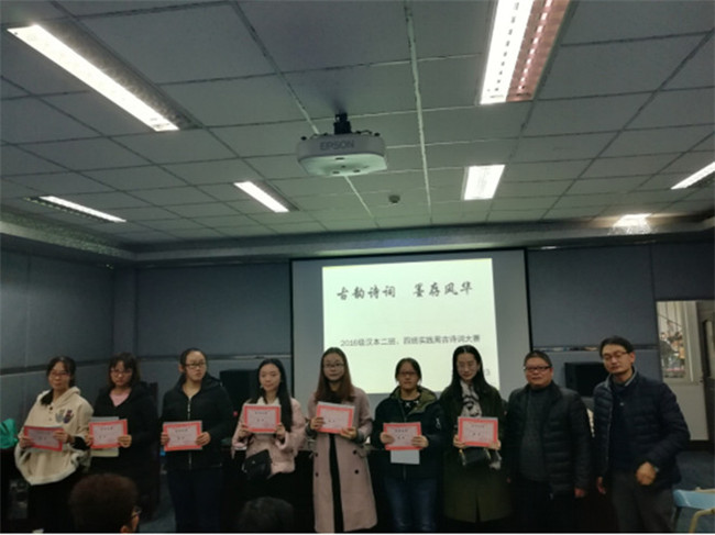 比赛的最后,到场的每位领导和老师为本次比赛做出了精彩的点评和总结,并为获奖的同学颁发奖状和奖品。此次大赛亮点纷呈,不仅展示了许多同学的诗词积累,也激发同学们对诗词的热爱以及对中华民族光辉历史和灿烂文化的认同感,在创新与尝试中翻开了学院古诗词大赛的新篇章。(撰稿人:施明佳 审稿人:艾茂莉)