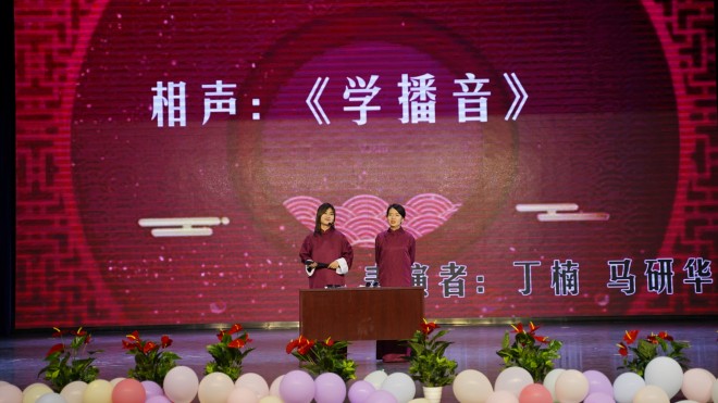 紧接着,由丁楠、马研华带来的相声节目《学播音》展示出了扎实的基本功功底和专业技能。两位同学口齿伶俐、妙语连珠的“绕口令大比拼”,让在座观众纷纷拍手叫绝。此外,两位同学还发起了“史上最难绕口令”的现场挑战,老师同学积极参与,现场气氛活跃,欢声笑语不断。